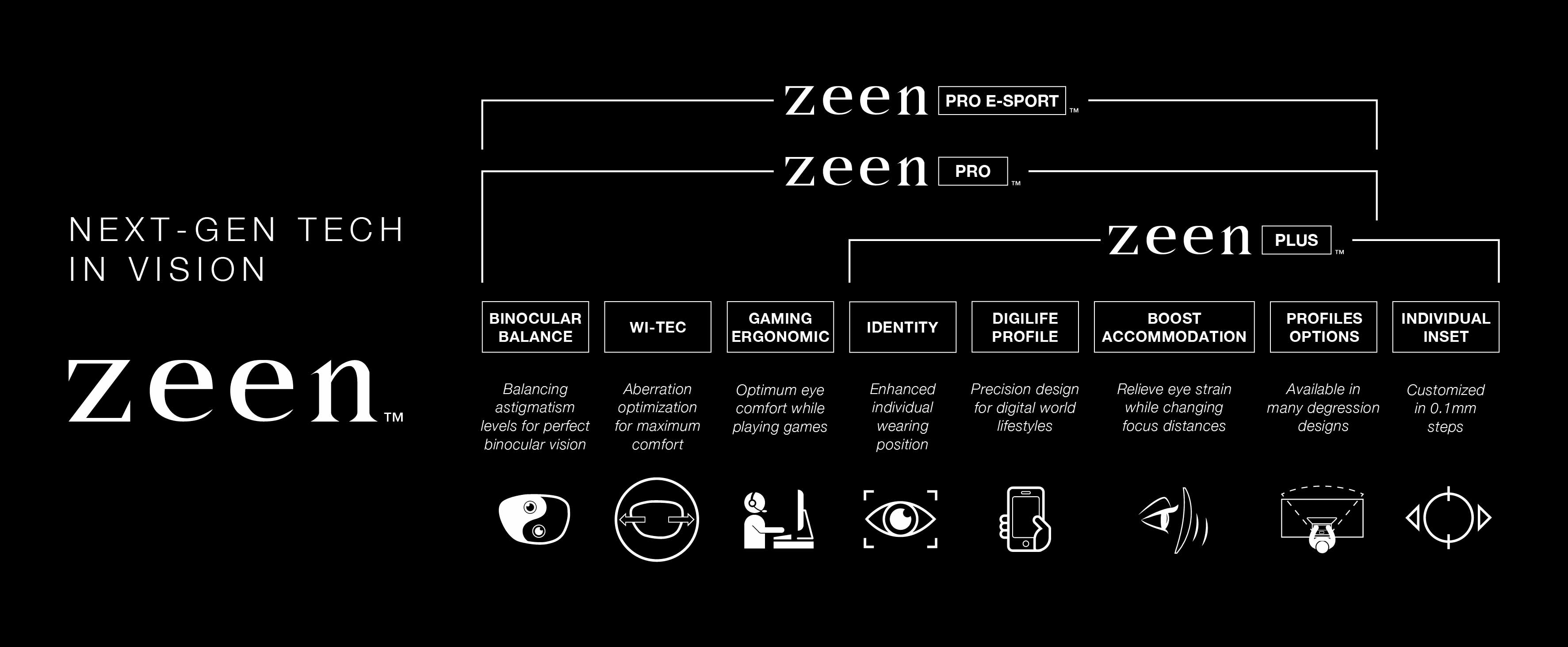 Zeen Pro E-Sport™ is Individual occupational digital gaming lenses with FREEFORM, BOOST ACCOMMODATION and an ERGONOMIC DESIGN, specifically designed for Zeen Pro E-Sport™ or highly static users, who spend over 3 continuous hours on digital devices.