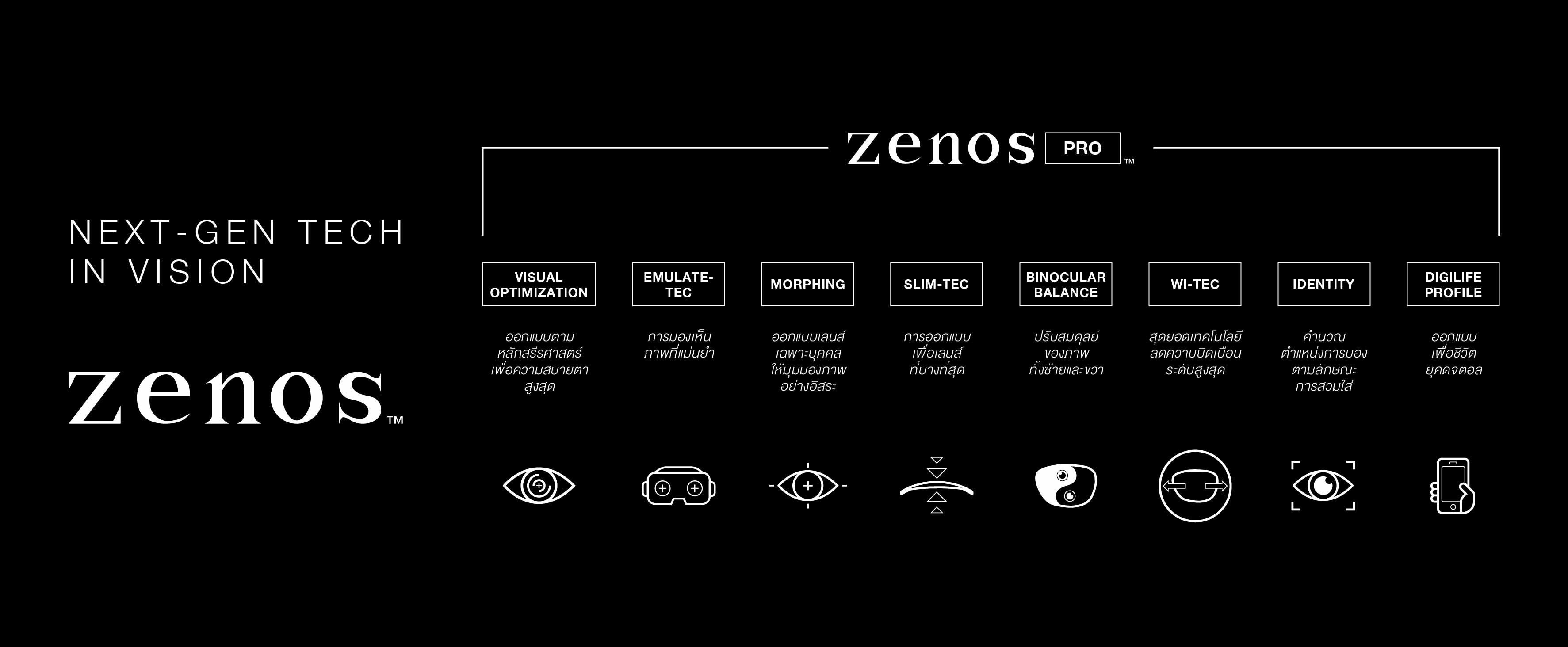 Zenos Pro™ เลนส์โปรเกรสซีฟดิจิตอลเฉพาะบุคคลที่ออกแบบด้วยเทคโนโลยี VISUAL OPTIMIZATION, EMULATE-TEC และ MORPHING ซึ่งปรับให้เข้ากับผู้ใช้งานเพื่อความสบายตาสูงสุด