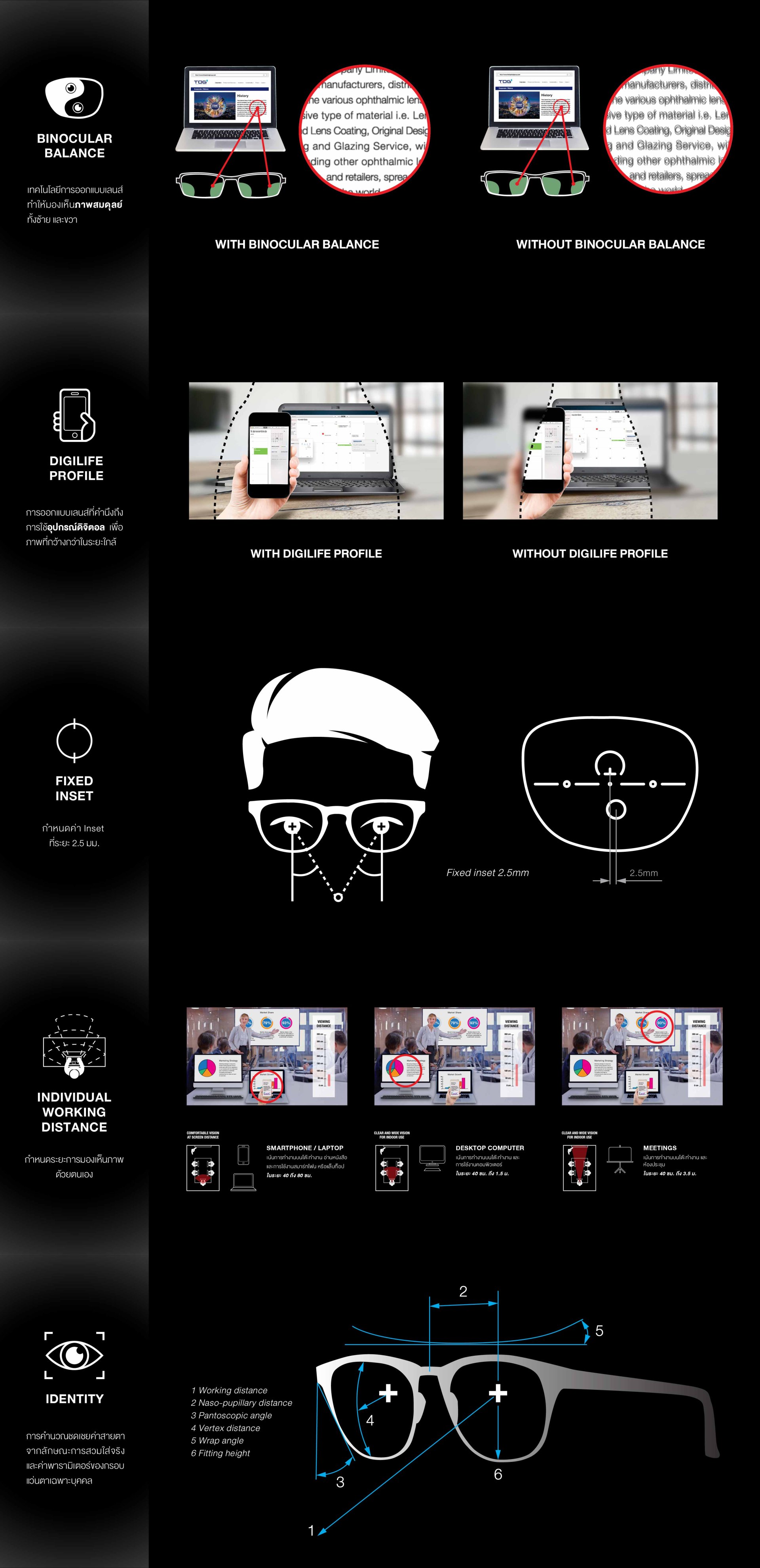 - ให้วิสัยทัศน์ที่ยอดเยี่ยมทั้งระยะไกล-กลาง ที่ออกแบบและชดเชยค่าพารามิเตอร์จากการสวมใส่อย่างแท้จริง